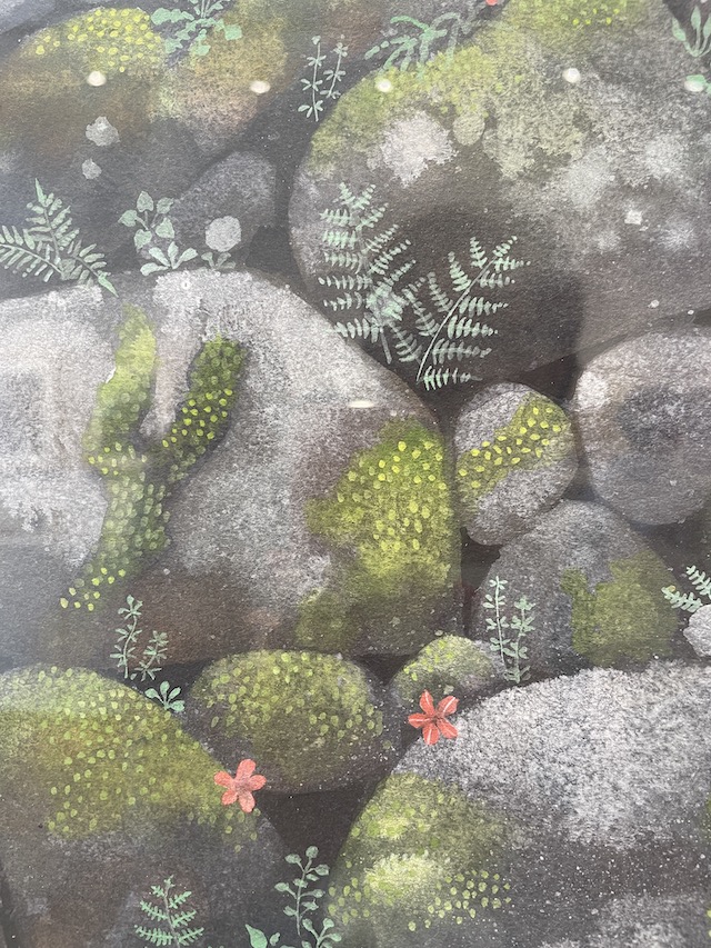 最近、仕事をよく見ていて好きな作家さんです。透明感があって物語を感じさせる絵が好き。どんなふうに描いているのか気になってしげしげと見てしまいました。厚塗りでなく色を重ねてテクスチャーを出しているんですね。勉強になりました。