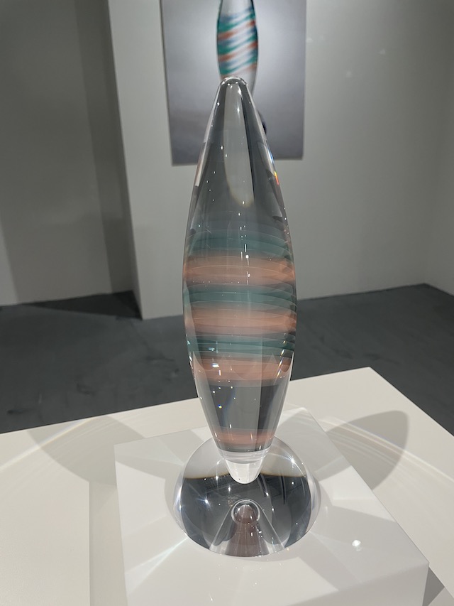 やよいさんは現代アートのジャンルに入ると思うけど、フォルムもさることながら、アクリルの積層を重ねることによって、見る角度からさまざまなイメージと色彩を生んで、なんとも言えず美しい。また、微妙なバランスで組み合わせているのでユラユラ感が気持ち良くて、2番目の作品はお買い上げになったようで良かったね。