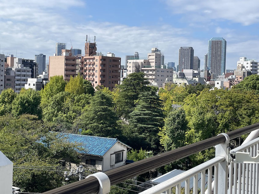 saceさんちのベランダからの風景、富岡八幡宮の森ももう見納めでした。